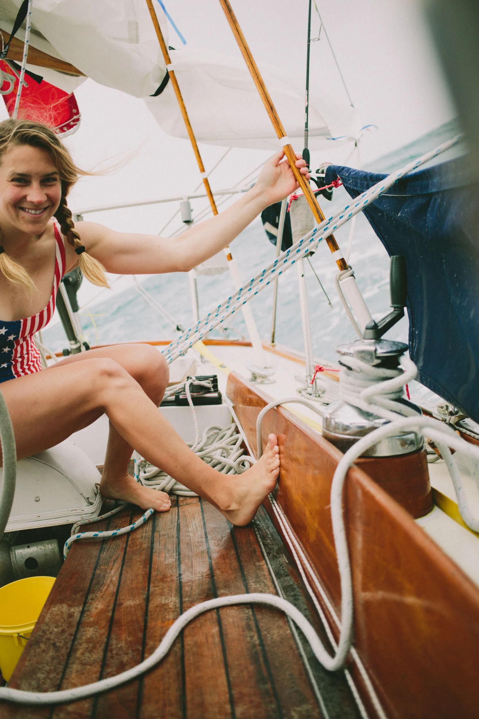 I am celebrating my favorite day of the year, in my favorite outfit, in a gale, in the rain, alone. I’ve set up my self-timer to document this historic moment. The camera hangs from a sail tie in the companionway and oscillates with the swells. I take at least 37 self- timed photos before I get one with all body parts appropriately placed either inside my leotard or outside of the photograph. I smile big. It’s genuine. I am having a blast.